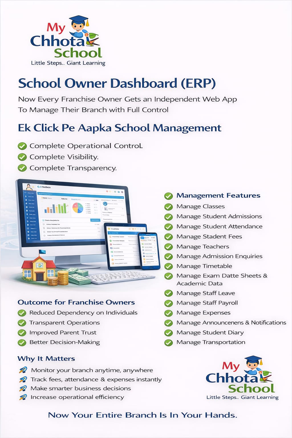 Apne playschool ko AI-powered smart school me transform karein. Admissions badhayein, parents ko impress karein, system ko automate karein.